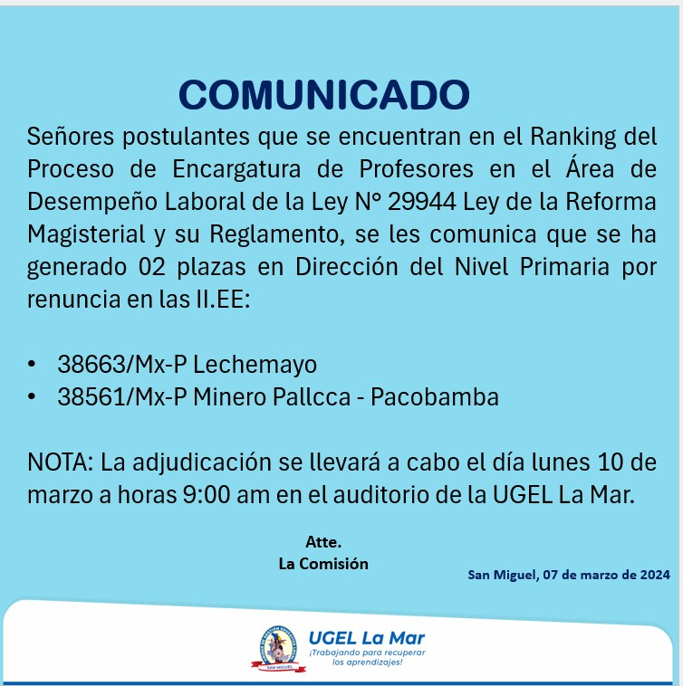 Nota: La adjudicación se realizará este lunes 27 de enero de 2025, a las 12:30 a.m., en el Auditorio de la UGEL La Mar.