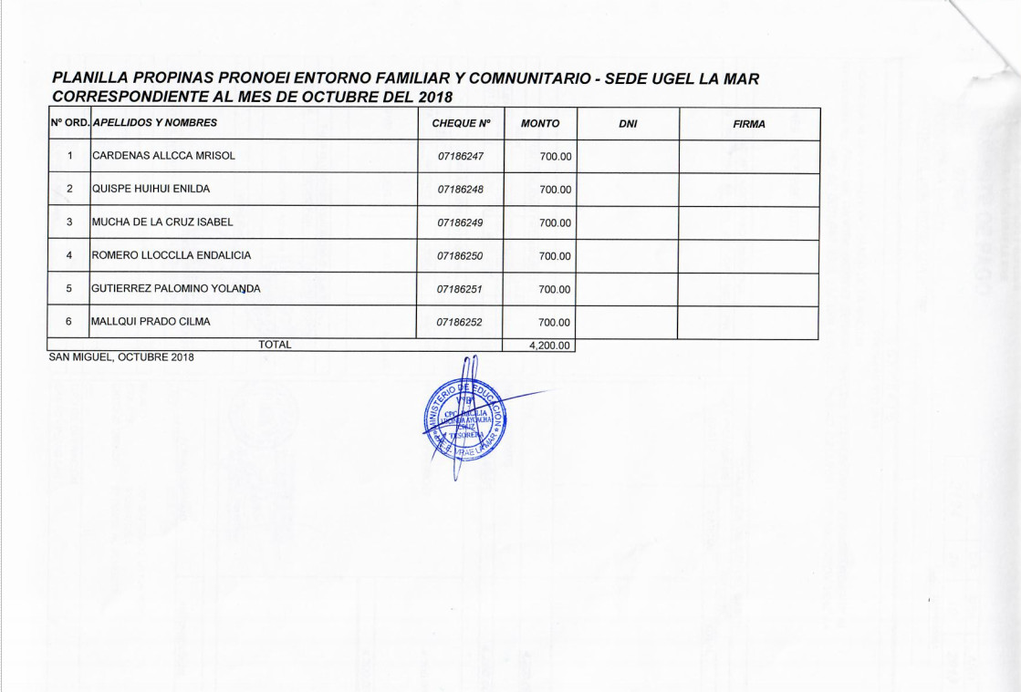 PAGO DE PROPINAS PRONOEI, ENTORNO FAMILIAR Y COMUNITARIOS, CORRESPONDIENTE AL MES DE OCTUBRE.